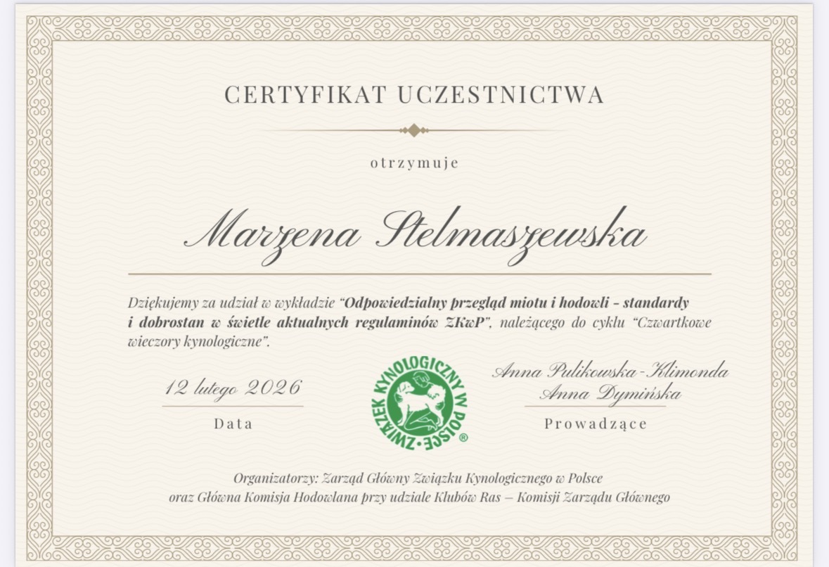 CERTYFIKAT - KOJARZENIE PSÓW ZALETY I RYZYKO STOSOWANIA RÓŻNYCH METOD HODOWLANYCH