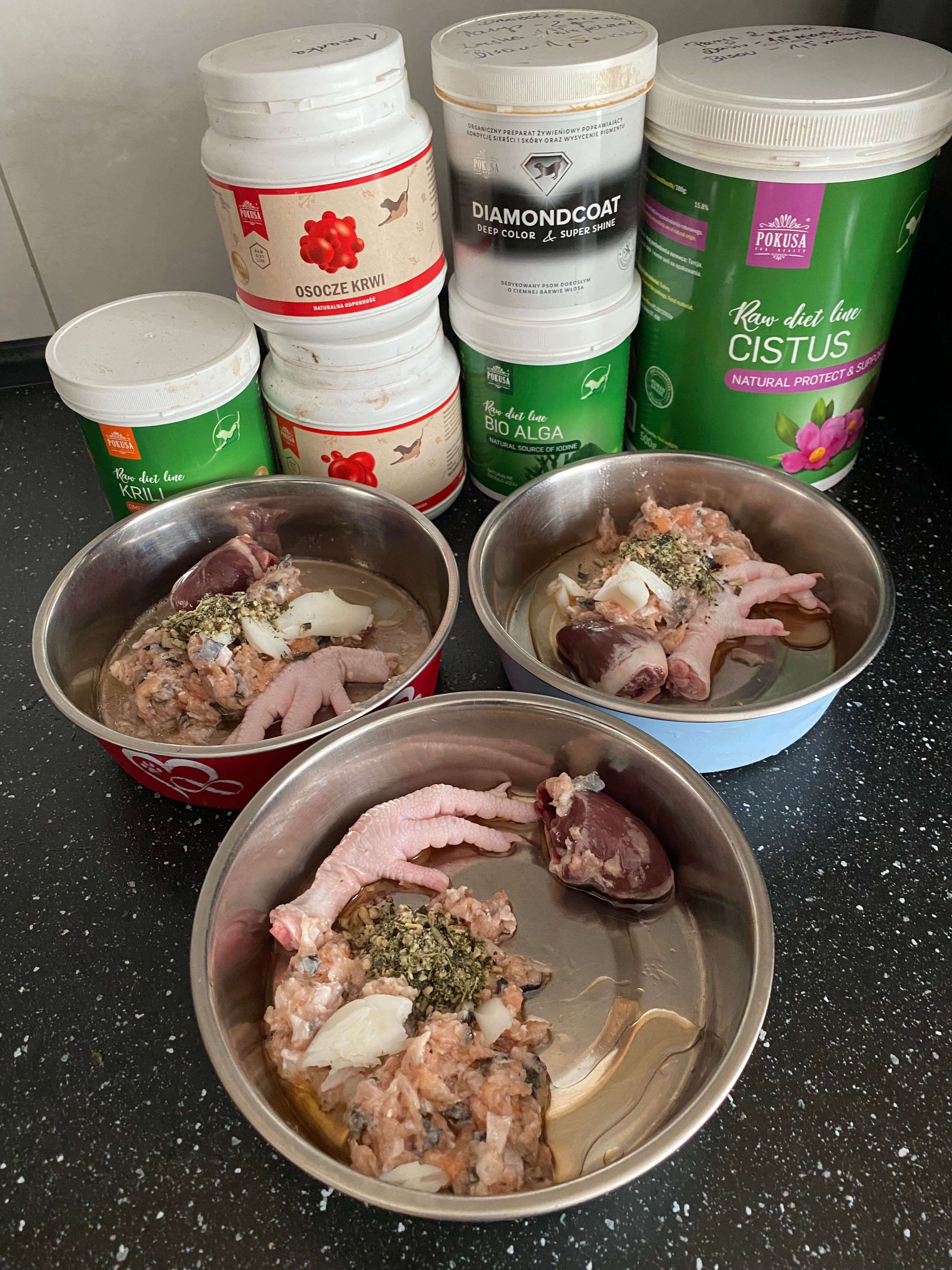 Często dodaje się też naturalne suplementy: algi morskie, drożdże browarnicze, oleje rybne, wapń i minerały, aby wspierać rozwój kości, stawów, sierści i odporności.
